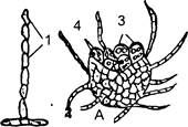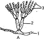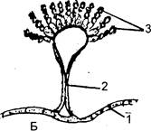 II. Практична частина 2.1. Ознайомтесь з систематичним положенням запропонованих видів сучмчастих грибів. Систематичне положення досліджуваних об'єктів Клас Аскоміцети Ascomycetes Підклас Геміаскоміцети - Hemiascomycetidae Порядок Ендоміцетові - Endomycetales 1. Хлібні дріжджі - Saccharomyces cerevisiae 2. Підклас Еуаскоміцети - Euascomycetidae Група порядків Плектоміцети - Plectomycetiidae Порядок Евроцієві Eurotiales 2. Пеніцил золотистий Penicillium chrysogenum 3. Аспергіл чорний - Aspergillus niger Підклас Плодосумчасті E uascomycetidae Група порядків Пірепоміцети - Pyrenomycetiidae Порядок Борошнисторосяні або еризифові - Erysiphales 1. Борошниста роса злаків - Erysiphe graminis 2. Американська борошниста роса аґрусу - Sphaerotheca iuors-uvae Порядок Клавіципітальні - Clavicipitales 3. Клавіцепс пурпуровий - Claviceps purpurea. Підклас Плодосумчасті - Enascomycetidae Група порядків Дискоміцети Discomycetiidae Порядок Пецицієві - Pezizales 1. Пециця фіолетово-чорна - Peziza violaceo-nigra 2. Зморшок їстівний - Morchella escnlenta 3. Строчок звичайний - Gyromitra esculenta Порядок Трюфельні - Tuberales 4. Трюфель білий - Choiromyces meandritormis 2.2. Виготовіть тимчасовий водний препарат з культури клітин хлібних дріжджів. При малому і великому збільшенні мікроскопа розгляньте клітини гриба, зарисувати ті з них, що діляться шляхом брунькування (рис.1). 2.3 Виготовіть тимчасовий водний препарат міцелію пеніцила (зіскоб зеленуватого кольору на шкірці цитрусових). Вивчіть при малому та великому збільшенні мікроскопа і зарисувати конідієносці та конідії (рис. А). 2.4. Виготовіть тимчасовий водний препарат міцелію аспергіла (зіскоб зеленуватого нальоту на скоринці хліба чи інших рослинних продуктах). Вивчіть при малому і великому збільшенні мікроскопу і зробіть позначення на рис. Б., позначивши конідієносці і конідій аспергіла. 2.5. Виготовіть тимчасовий водний препарат з міцелію борошнистої роси злаків і сферотеки агруса. При малому збільшенні мікроскопа вивчіть будову міцелію і плодових тіл (клейстотеціїв) борошнистої роси. Розгляньте рис.3. 2.6. Вивчіть зовнішні ознаки хвороби злаків — клавіцепсу пурпурового. Зарисуйте уражені клавіцепсом колоски жита. Зарисуйте плодове тіло - перитецій. 2.7. Розгляньте і зробіть відповідні позначення на рисунку “Зовнішній вигляд зморшка і строчка (рис.5).