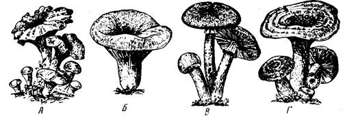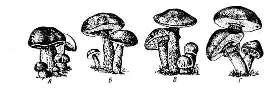 Хід роботи І. Теоретичні відомості Міцелій добре розвинутий, клітинний Нестатеве розмноження відбувається за допомогою конідій Статевий процес — соматогамія Спори статевого розмноження утворюються екзогенне, на бази дії. Клітинна стінка містить хітин і глюкани. Систематичне положення досліджуваних об єктів Клас Базидіоміцети — Basidiomycetes Підклас Холобазідіоміцети — Holobasidiomycetidae Група порядків Гіменоміцети — Hymenomycetidae Порядок Афілофоральні — Aphyllophorales Родина Поліпорові — Polyporaceae Трутовик справжній — Fоmes:fomentarius Трутовик плоский — Ganoderma applanatum Трутовик лакований — Ganodenna lucidum Порядок Агарикальні — Agaricales Родина Агарикові — Agaricaceae Печериця двоспорова — Agaricus bisporus Бліда поганка — Amainta phalloides Родина Болетові — Boletaceae Білий гриб — Boletus edulis Група порядків Гастероміцети — Gasteromycetiidae Порядок Дощовикові — Lycoperdales Дощовик шипастий — Lycoperdon perlatum Земляні зірочки — Geastrum sp Порядок Склеродермові — Sclerodermales Дощовик несправжній - Scleroderma aurantium Порядок Фалові — Phallales Веселка звичайна — Phallus impudicus Підклас Теліобазидіоміцети — Teliobasidiomycetidae Порядок Сажковидні - Ustilaginales Сажка пшениці — Ustilago tritici Сажка ячмінна — U nuda Сажка кукурудзяна — U. zeae Порядок Іржасті — Uredmales Пукцинія злакова — Puccinia graminis f. sp. tritici Пукцинія соняшникова — Р helianthi II. Практична частина 2.1. Ознайомтесь з систематичним положенням запропонованих видів базидіальних грибів. 2.2. Розгляньте і зарисуйте зовнішній вигляд плодового тіла трутовика справжнього (рис.1.), визначити його вік. Ознайомтесь з колекцією трутовиків. 2.3. Розгляньте плодове тіло шапкового гриба печериці двоспорової. 2.4. Розгляньте і зарисуйте зовнішній вигляд плодового тіла білого гриба. На рисунку позначити ніжку, шапку, трубчастий гіменофор. На рис. 2 зробити відповідні позначення. Розгляньте колекцію базидіальних їстівних і отруйних грибів. Зробіть відповідні позначення на рис. 3.-4. 2.5. Розгляньте і зарисуйте зовнішній вигляд колоса ячменю, ураженого ячмінною сажкою (Рис.6). Приготувати тимчасовий водний препарат теліоспор, розглянути їх під мікроскопом при малому і великому збільшенні, зарисувати зовнішній вигляд. З'ясувати цикл розвитку ячмінної сажки. 2.6. Розгляньте і зарисуйте зовнішній вигляд колоса пшениці, ураженого сажкою пшениці. Приготувати тимчасовий водний препарат пшеницієвої сажки. Розглянути під мікроскопом при малому і великому збільшенні, зарисувати загальний вигляд теліоспор (Рис.5). 2.7. Розгляньте і зарисуйте зовнішній вигляд молодих тканин качана кукурудзи, уражених кукурудзяною сажкою (Рис.5). Приготувати тимчасовий водний препарат теліоспор, розгляньте під мікроскопом. Схема опису і визначення грибів Опис і визначення різних видів грибів можна проводити на лабораторному занятті або під час літньої навчально-польової практики, яку студенти проходять після вивчення курсу. 1. Консистенція плодового тіла (драглисте, сухе, тверде, пружне, шкірясте, пробкувате, дерев’янисте та ін.) 2. Форма плодового тіла (копитоподібне, подовжене, вухоподібне, кулясте, грушоподібне, чашоподібне. гніздоподібне, дзвоникоподібне, шапкове). 3. Розмір плодового тіла (діаметр шапки, довжина і товщина ніжки) Вказуються найменші і найбільші розміри (наприклад, 7-10 мм). 4. Забарвлення плодового тіла (або окремо шапки і ніжки). 5. Характер поверхні плодового тіла, або окремо ніжки і шапки. 6. Характер гіменофора (гладенький, складчасти