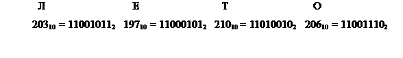 Чтобы записать символьную информацию в разрядную сетку компьютера, ее надо закодировать, затем код каждого символа перевести в двоичную систему счисления. Пример 29. Закодируем слово «ЛЕТО»: переведем в двоичную систему и запишем в разрядную сетку.