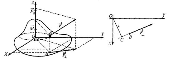 где — проекция силы на плоскость, перпендикулярную оси вращения; l — плечо силы (кратчайшее расстояние от оси вращения до линии действия силы).