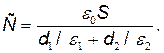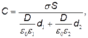 где σ - поверхностная плотность заряда на пластинах; Е 1 и Е 2 - напряженности поля в первом и втором слоях диэлектрика соответственно; D - электрическое смещение поля в диэлектриках. Умножив числитель и знаменатель равенства (2) на ε0 и учтя, что D=σ,окончательно получим