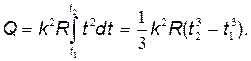 Здесь сила тока I является некоторой функцией времени. В нашем случае I=kt, (2) где k - коэффициент пропорциональности, равный отношению приращения силы тока к интервалу времени, за который произошло это приращение: k= Δ I/ Δ t =3 А/с. С учетом равенства (2) формула (1) примет вид dQ=k 2 Rt 2 dt. (3) Для определения количества теплоты, выделившегося за конечный промежуток времени Δ t,выражение (3) следует проинтегрировать в пределах от t 1до t 2: