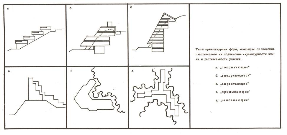 При рассмотрении скульптурного единства формируемой среды важен взгляд на землю в растительность участка как целостную скульптуру, а на архитектуру как пластический материал, способный дополнить и развить ее закономерности. Различные виды пластического соподчинения архитектуры с землей и растительностью определяют следующие типы архитектурных структур (рис.9): а) «покрывающие» 6} «внедряющиеся»; в) «вырастающие»; г) «примыкающие»; д) «заполняющие». Характерным видом «ПОКРЫВАЮЩИХ» структур являются террасированные. Выполняя функции покровной «ткани» или «одежды» они способны предавать и подчеркивать закономерности своего физического основания. Проблемам строительства террасных структур посвящено большое количество публикаций, как за рубежом, так и в нашей стране. Однако эти публикации не рассматривают их под интересующим нас углом зрения, то есть с точки зрения взаимодействия внутрисистемных связей с внесистемными. Попытаемся взглянуть на эти здания как на модель, которая поможет раскрыть важный принцип дополнительности этих связей.