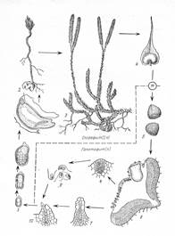 Рис.14.2. Жизненный цикл плауна булавовидного (Lycopodium clavatum). 3. На гербарном материале рассмотреть особенности строения представителей Отдела Хвощёвые, выписать представителей сделать схематическое изображение в тетради жизненного цикла (Рис.14.2) Хвоща полевого (Equisetum arvense):
