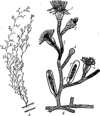 Рис. 95. Гидроид Obelia. A — колония (слегка увеличено); Б — отдельная веточка колонии (несколько схематизировано, часть особей колонии изображена в разрезе) (по Абрикосову): 1 — гидрант в расправленном состоянии, 2 — сократившийся гид