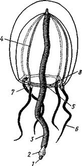 Рис. 96. Сравнение строения гидроидного полипа (Л) и гидроидной медузы (Б), перевернутой ротовым отверстием кверху (по Холодков- скому): I — рот, 2 — щупальца, 3 — гас-тральная полость, 4 —мезоглея, 5 — радиальный канал, 6 — парус Рис. 97. Гидроидная медуза Sarsia (рис. А. Наумова): J — рот, 2 — ротовой стебелек с расположенной на нем гонадой (3), 4 — радиальные каналы, 5 — кольцевой канал, 5 — щупальца, 7 — глазки, 8 — парус органическую оболочку — теку, которая придает ему большую устойчивость. Тека доходит до основания гидрантов (подотряд Athecata), а иногда продолжается и на них самих (подотряд Thecaphora) в виде защитного колпачка, или гидротеки. Размножение морских гидроидных полипов, образование и строение медуз. Сами полипы способны лишь к бесполому размножению почкованием, в гидрантах половые железы не образуются. Они формируются лишь в специальных, возникающих на колонии тоже путем почкования половых особях, медузах, переходящих к свободноплавающему образу жизни. Сначала на известных местах стебля колонии появляется вырост, напоминающий зачаток гидранта. Этот вырост сильно вытягивается и превращается в полый столбик, видоизмененный полип — бластостиль, по бокам которого выпочковываются зачатки медув. Каждый зачаток постепенно превращается в молодую медузу, которая отрывается от бла-стостиля и уплывает. Медузка растет, развивает в себе половые клетки и приступает к половому размножению. Иногда медузы выпочковываются поодиночке, без бластостиля. Медузы, за исключением некоторых отклонений в организации пищеварительной системы, построены по той же схеме, что и полипы, но часто сильно сплющены в плоскости, перпендикулярной к главной оси тела (рис. 96). Медуза имеет вид колокола или зонтина; наружная выпуклая сторона называется эксумбреллой, внутренняя вогнутая — субумбреллой (рис. 97). Посредине последней выдается более или менее длинный ротовой стебелек со ртом на свободном конце. Рот ведет в пищеварительную, или гастральную, полость, состоящую из центрального желудка и расходящихся от него к краям зонтика радиальных каналов в числе, равном четырем или кратном четырем, и соединенных в толще мезоглеи сплошной энтодермальной пластинкой. На краю зонтика все радиальные каналы сообщаются между собой посредством кольцевого канала. Желудок и каналы в совокупности образуют гастроваскулярную (т. е. кишечносо-судистую) систему. По свободному краю зонтика прикреплена тонкая кольцевидная мускулистая перепонка, суживающая вход в полость колокола. Она называется парусом и является характерной особенностью гидроидных медуз, отличающей их от медуз, принадлежащих к Scypho-zoa. Парус играет важную роль при движении медуз. На краю зонтика расположены, кроме того, щупальца. Они, подобно радиальным каналам, имеются в определенном числе, чаще всего кратном четырем. Вследствие правильного расположения радиальных каналов и щупалец лучистая симметрия медуз ярко выражена. Тело медуз характеризуется сильным развитием мезоглеи, которая очень утолщается и содержит большое количество воды, приобретая студенистый желеобразный вид. Благодаря этому все тело медуз почти стекловидно и прозрачно. Прозрачность, свойственная очень многим планктонным животным, рассматривается как особый род покровительственной окраски, укрывающей животное от врагов.