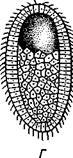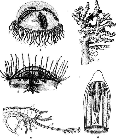 Рис. 102. Различные Hydrozoa. А — ядовитая медуза «Крестовичок» (Gonionemus); £ — пресноводная медуза Craspedacusta; В — схема строения Porpita — представителя отряда Chondrophora; Г— известковая колония Hydrocorallia; Д — трахимедуза Aglantha (по Наумову, В — из Байера): / — ротовое отверстие, 2 — кишечная полость. 3 — хитиноидная скелетная пластинка, 4 — гонофоры, 5 — щупальце ках, сваях и т. п. Отдельные гидранты очень мелкие, чаще не более 1 мм, только некоторые Athccata, например Tubularia (рис. 101), достигают нескольких сантиметров, а обитающий у берегов Японии одиночный полип Branchiocerianthus— даже до 1 м. Медузы обычно тоже небольшой величины, от 5 мм до 2—3 см в диаметре зонтика, редко бывают крупнее. Большинство представителей отр. Leptolida обитает в море, п пресных водах встречается лишь несколько видов подотряда Limnomedusae, характеризующегося преобладающим развитием медузоидного поколения. Так, в пресноводных водоемах субтропиков и тропиков всех материков, а также в аквариумах с тропическими растениями и рыбками периодически появляются медузы Craspedacusta (рис. 102, Б). К, лимпомеду-зам относится также очень ядовитая морская медуза «крестовичок» (Gonionemus), обитающая у берегов Японского моря и Курильских островов (рис. 102, А). Полипы этих видов едва заметны простым глазом и не образуют колоний. Представители Hydrocorallia (рис. 102, Г) отличаются массивным известковым скелетом, напоминая этим некоторых коралловых полипов (с. 140). Встречаются в умеренных и тропических морях. Отряд 2. Chondrophora — крупные одиночные полипоидные формы, обитающие па поверхности воды тропических морей. Тело уплощенное, рот, щупальца и гонофоры обращены вниз (рис. 102, В). На аборалыгой стороне имеется хитиноидная пластинка, соответствующая теке других гидроидных. У Vclella (табл. V, 2) она выступает вверх о виде треугольного паруса. Отряд 3. Trachylida — чисто мсдузоидные формы, не имеющие смены поколений. Относящаяся сюда Aglantha (рис. 102, Д) встречается по всему Мировому океану, другой представитель — Сипта паразитирует на медузах отряда Leptolida. Вообще среди кишечнополостных насчитывается очень немного паразитических форм. Особый интерес среди них представляет вид Polypodium hydriforme, систематическое положение которого до сих пор не установлено. Polypodium паразитирует на яйцах осетровых рыб. В икринке хозяина Polypodium имеет вид длинного извитого тяжа— столона, образующего на себе ряд почек со щупальцами. Интересно, что внутри икринки почки Polypodium находятся в вывернутом наизнанку состоянии: эктодерма его обращена внутрь, а энтодерма — наружу к питательному желтку яйца. Позднее почки выворачиваются эктодермой наружу и, когда икра отложена в воду, столон расч издается; образуется 60—90 полипов, которые переходят к свободной жизни, прикрепляясь ко дну. В течение лета полипы размножаются продольным делением. К осени на них образуются половые железы. Дальнейшая судьба полипа и способ заражения хозяина неизвестны. Отряд 4. Hydrida — одиночные формы, чисто полипоидные, без чередования поколений. Представитель — пресноводная гидра Hydra и немногие другие. В ископаемом состоянии гидроидные известны, начиная с силура. Главным образом это массивные известковые Hydrocorallia. Имеются также отдельные сведения о нахождении ThecapKiora, уже начиная с кембрия. ПОДКЛАСС II. СИФОНОФОРЫ (SIPHONOPHORA) Сифонофоры — свободноплавающие морские животные, встречающиеся преимущественно в теплых морях. Ко
