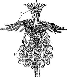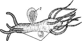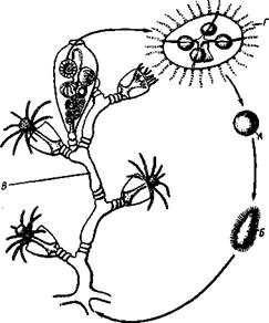 Большинство Hydroidea имеет типичное чередование поколений. У некоторых представителей, однако, наблюдается уклонение от намеченной схемы, сказываю- щесся в частичном подавлении одного из поколений, а именно медузоидного. Образующиеся на колонии медузы перестают отрываться от нее и, оставаясь на месте, т. е. на бласто-стиле, развивают в себе половые клетки. Такие медузы, или медузои-ды, отличаются недоразвитием рта, органов чувств и некоторых других органов. Подавление медузоидного поколения может идти еще дальше, причем медузы постепенно утрачивают характерную форму и превращаются в простые, набитые половыми клетками мешки (гонофоры), сидящие на колонии полипов (рис. 101). Будучи сначала свободнопод-вижным самостоятельным поколением, медузы, таким образом, постепенно становятся как бы половыми органами колонии полипов: интересный пример низведения особи до степени простого органа. Но иногда изменение в смене поколений идет, по-видимому, в обратном направлении, причем медузоидное поколение получает полное преобладание над полипоидным. По крайней мере, подобно тому как мы встречаем среди гидрозоев формы чисто полипоидные (гидра), не дающие никогда медуз, точно так же есть группа медуз (отр. Trachylida), которые в течение всего жизненного цикла остаются медузами. Они похожи на описанных раньше гидроидных медуз; планула этих медуз не