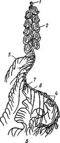 Кроме гастрозоидов на стволе сидят еще другие полипообразные особи — пальпопы. Это как бы упрощенные гастрозоиды с неразветвленным простым щупальцем. Функция их неясна, но предполагается, что они имеют выделительное значение. Обязательно имеются и половые медузоиды (гонофоры), построенные по типу медуз (вроде прикреплённых медузоидов на колониях некоторых форм из отр. Leptolida) и содержащие половые железы. На одной колонии бывают два сорта медузоидов — мужские и женские. Расположение особей на теле сифонофор различно, но чаще всего таково: воздушный пузырь один и занимает вершину ствола; под ним располагаются плавательные колокола. Прочие особи сидят на стволе группами, разделенными известными промежутками. Группы называются корми-днями, причем каждая обычно слагается из двух половых медузоидов, гастрозооида и пальпопа. Кроме того, часто кормидий бывает прикрыт особой кроющей пластинкой, представляющей также видоизмененную особь. Размножение и развитие. При половом раз- Рис. 103. Схема строения сифонофоры (А) (по Холод-ковскому) и сифонофора Halistemma (Б) (по Деляжу и Эруару): / — пневматофор, 2 — плавательный колокол (нектофор), 3 —половая особь (гонофор), 4— кормящий полип (гастрозоид), 5 — арканчик, 6 — кроющая пластинка, 7 — выделительный полип со щупальцем (пальпон), 8 — ствол колонии