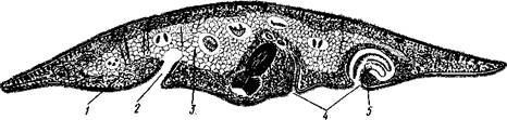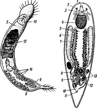 Размножение и развитие. В большинстве случаев размножение только половое. Эмбриональное развитие в разных отрядах ресничных червей сильно различается. Обычно яйца испытывают полное, но неравномерное дробление, напоминающее спиральный тип дробления кольчатых червей (см. далее). Бластомеры яйца еще до образования гаструлы дифференцированы на микромеры, из которых получается в дальнейшем эктодерма, и на 4 макромера, дающих начало энтодерме и мезодерме. У морских турбеллярий отр. Polycladida развитие сопровождается метаморфозом. Из яйца выходит так называемая мюлле-ровская личинка (рис. 132), отличающаяся от взрослой особи многими существенными признаками.