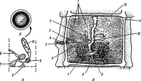Рис. 159. Строение половой системы бычьего солитера Taeniarhynchus saginatus (отр. Cyclophyllidea). A — схема строения женской половой системы; Б — яйцо с заключенной внутри онкосферой (по Смиту); В — гермафродитный членик бычьего солитера (по Полянскому): / — семенники, 2 — семявыносящие протоки, 3 — семяпровод, А — совокупительный орган, 5 — половая клоака, 6 — влагалище, 7 — яичник, 8 — желточник, 9 — оотип, 10 — матка, // — продольный выделительный канал, 12— поперечная перемычка, соединяющая продольные выделительные каналы. Матка слепо замкнута. Яйца лишены крышечки, развиваются в матке. Свободного корацидия нет гаются большей или меньшей атрофии. Членики, в которых осталась лишь сильно разветвленная и набитая яйцами матка, называют «зрелыми». Зрелые членики занимают задний конец цепочки и периодически отрываются целыми группами. Наиболее крупные из цестод образуют в течение своей долгой жизни поистине колоссальное количество яиц. Так, например, паразитирующий в кишечнике человека невооруженный це-пень (Taeniarhynchus saginatus) в среднем живет 18—20 лет и за год продуцирует до 600 млн. яиц, следовательно, за всю свою жизнь цепень производит около 11 млрд. яиц. У других цестод может быть ряд разнообразных отступлений. Так, матка, слепо замкнутая у цепня, нередко (например, у Diphyllobothrium и др.) открывается наружу на одной из плоских сторон членика (рис. 160). У таких видов яйца по мере заполнения ими матки выходят из нее в кишечник животного-хозяина. Мужское отверстие и отверстие влагалища могут при этом смещаться на одну из плоских сторон членика. Любопытным изменением является наблюдаемое у некоторых форм частичное или полное удвоение полового аппарата в каждом членике (например, у тыквенного цепня — Dipylidium caninum). Размножение и развитие. Оплодотворение у ленточных червей происходит как перекрестно, так и посред- 2 ю t9 g 1 ством самооплодотворения, причем совокупительный орган одного чле-