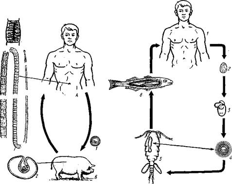 Рис. 162. Жизненный цикл свиного" солитера. А — окончательный хозяин (человек), в котором паразитирует половозрелая стадия; Б — промежуточный хозяин (свинья), пожирающая яйца (по Ноблю, изменено): / — яйцо цепня с онкосферой внутри, 2 — финна, развивающаяся в мышцах свиньи, 3—половозрелая стадия, 4 — отдельный зрелый членик, выходящий из кишечника человека. Заражение человека возможно при употреблении в пищу непрожаренной свинины Рис. 163. Схема жизненного цикла широкого лентеца: 1 — окончательный хозяин (человек), в котором паразитирует половозрелая стадия, 2 — выходящие из кишечника человека во внешнюю среду яйца лентеца, 3 — вылупление корацидия, 4 — свободный корацидий, 5 — первый промежуточный хозяин (циклоп) с процеркоидом в полости тела, 6 — второй промежуточный хозяин (рыба) с пле-роцеркоидом в мускулатуре. Человек заражается, употребляя в пищу плохо проваренную рыбу с плероцеркоидами