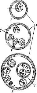 Помимо плероцеркоида и описанной выше финны свиного солитера существуют и другие формы финн (рис. 165). Тип строения финны, свойственный свиному солитеру, называется цистицерком. Как уже указывалось, это небольшой полый пузырь с ввороченной в него одной головкой. Особый род финн, ценур, имеется в тех случаях, когда пузырь финны сильно разрастается и на стенках его вместо одного впячивания образуется множество их, т. е. в одном пузыре закладывается много головок, каждая из которых дает начало половозрелой ленточной особи. Наконец, особенно сильного развития достигают финны — эхинококки. Пузырь эхинококка вырастает до огромных размеров и образует внутри себя и на стенках много вторичных пузырей меньшей величины — выводковых капсул. На внутренних стенках капсул формируются, в свою очередь, многочисленные впячивания головок; таким образом, каждая выводковая капсула эхинококка отвечает как бы одному ценуру, а единствен-ный шестикрючный зародыш дает начало несколь- т т ния различных типов ким тысячам головок. Несмотря на внешние разли- финн (по Скрябину и чия, все перечисленные формы финн являются раз- Шульцу). А— цисти- новидностями одного общего основного типа. иерк; £ — ценур; б — г}0 характеру жизненного цикла, представляю- ; - стенк"Н°пузыря фин- щего развитие, сопровождающееся метаморфозом, ны, 2 -ввернутые голов- цестоды стоят ближе к моногенеям, чем к трема- вок Зв~доч2рнихнипеузгь?ря°х тодам. Последним, как известно, свойственно чере- дование поколений типа гетерогонии. Однако у тех видов цестод, развитие которых связано с формированием ценура или эхинококка, жизненный цикл вторично усложняется. В него привходит бесполое размножение пузырчатой стадии, дающей путем почкования множество дочерних головок (сколексов). Имеет место чередование двух поколений — полового и бесполого, т. е. метагенез. Значение умножения головок состоит (так же как и при размножении редий и спороцист сосальщиков) в увеличении численности потомства и соответственно в усилении возможности заражения окончательного хозяина. Своеобразный членистый характер тела большинства взрослых лентецов породил несколько отличающихся друг от друга толкований их организации и природы их стробилы. По теории колониальности, или полизоичности, цепочка ленточного червя представляет собой колонию индивидов, образовавшуюся путем бесполого размножения, а именно концевого почкования от одной первичной особи, т. е. сколекса. Каждый членик представляет собой особь такой колонии. При этом цепочка сравнивается со стро-билой сцифомедуз (с. 132), а сколекс — с первичным полипом стробилы — сцифистомой. В пользу теории колониальности цестод свидетельствуют следующие факты: 1) возможность только что приведенного сравнения с примерами из других групп животных; 2) наличие в каждом членике вполне самостоятельного полового аппарата; 3) значительная независимость от головки, достигаемая члениками некоторых ленточных червей; так, группы набитых яйцами члеников Taeniarhynchus saginatus, оторвавшиеся от цепочки и выведенные наружу, могут ползать еще много часов. Еще большей самостоятельности достигают членики некоторых цестод из кишечника акул (например, Echinobothrium, Trilocularia; рис. 166). Они поодиночке отрываются от стробилы еще незрелыми, долгое время живут в кишечнике хозяина, сильно вырастают за эт