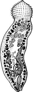 один частный случай, например бычьего, или невооруженного, солитера (Taeniarhynchus saginatus) (рис. 159). В молодых передних члениках стробилы половые органы еще не развиты и начинаются приблизительно лишь с 200 членика. В следующих члениках с вполне развитой половой системой мужской отдел последней состоит из многочисленных семенников, разбросанных в паренхиме. Тонкие семявыносящие протоки семенников соединяются вместе и образуют общий семяпровод. Последний направляется к одной из узких боковых граней тела и там пронизывает собой совокупительный орган, имеющий вид мускулистой трубки, которая своим концом вдается в глубокую ямку на боковой грани тела — половую клоаку. Женский отдел системы состоит из ветвистого яичника, проток которого, яйцевод, впадает в оотип, как у трематод. В оотип же поступает и содержимое непарного желточника — сетевидной железы, прилегающей к задней стенке членика. Кроме того, от оотипа отходят два канала. Один, влагалище, тянется рядом с семяпроводом и открывается подле него в половую клоаку. Другой, более широкий, направляется от оотипа вперед по срединной линии членика и заканчивается слепо, это — матка. Яйцеклетки поступают в оотип, куда проникают и спермин через влагалище. В оотипе яйца оплодотворяются, окружаются скорлупой и переводятся в матку, где проходят первую часть своего развития. У цеп-ней вследствие отсутствия выводного отверстия яйца остаются в матке долго и выходят наружу лишь при разрыве стенок членика. Яйца настолько переполняют матку, что последняя сильно разрастается, дает от своего главного ствола много боковых ветвей в обе стороны и занимает значительную часть членика (см. рис. 162). К этому времени все остальные части половой системы заканчивают свою функцию и подвер-