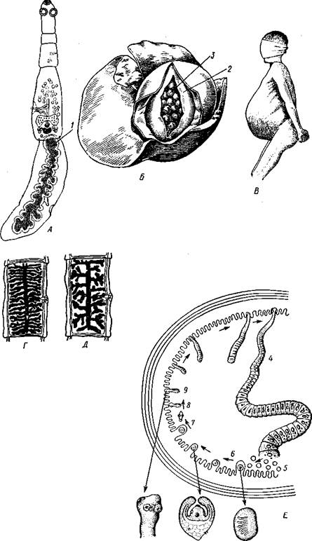 Рис. 168. Представители ленточных червей, паразитирующих у человека. А — эхинококк Echinococcus granulosus — половозрелая стадия из кишечника собаки; Б — пузырчатая стадия эхинококка в печени человека; В — человек, пораженный эхинококком (по Брауну); Г — зрелый членик бычьего солитера; Д— зрелый членик свиного солитера; Е — цикл развития карликового цепня Hymenolepis папа из кишечника человека: