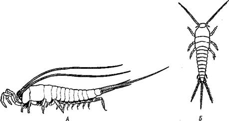 Рис. 366. Щетинкохвостки. А — Machllis sp., вид сбоку; Б — Lepisma saccharina (по Снодграссу и Стаху) земные или надземные гнезда — термитники, нередко значительно выше человеческого роста. Общины состоят из нескольких каст: рабочих, солдат, половых особей. Ротовой аппарат грызущего типа. Превращение неполное. Причиняют вред, поедая деревянные части строений, книги,