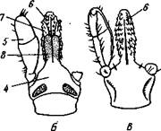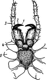 Рис. 392. Собачий клещ Ixodes п-cinus. A — самка, вид со спинной стороны (по Померанцеву); Б — ротовые органы со спинной стороны; В — то же, с брюшной стороны (из Догеля): / — хоботок, 2 — туловище, 3 — ходные ноги, 4 — основание хоботка, 5 — педи-пальпа, 6 — гипостом, вырост основания хоботка, 7 — хслицеры. 8 — кроющие пластинки Рис. 393. Ротовые органы паука крестовика Araneus diade-matus (по Иванову): 1 — конечный когтевидный членик хелицеры, 2 — основной членик хе-лицеры, 3 — педнпальпа, 4 — жевательный вырост основного членика педипальпы, 5 — основной членик ходной ноги
