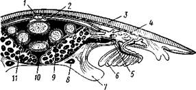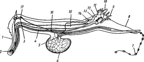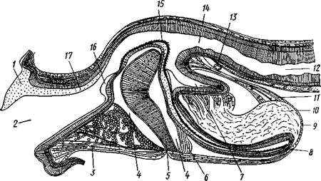 Рис. 444. Срединный разрез через глотку виноградной улитки Helix pomatia (по Траппману): / — челюсть, 2 — ротовая полость, 3 — мускульная стенка глотки, 4 — кровеносные полости языка, 5 — радулярный хрящ, 6 — внутренняя глоточная мышца, 7 — складка глоточного эпителия, 8 — образующий радулу эпителий, 9 — радулярное влагалище, 10 — соединительная ткань радулярного влагалища, 11 — мускул, поддерживающий радулярное влагалище, 12 — пищевод, 13 — буккальная комиссура, 14 — полость глотки, /5 — радула, 16 — язык, 17 — Интересные изменения испытывает печень у голожаберных (подкл. Opisthobran-chia, с. 472). У многих из них печень как бы разбивается на систему отходящих от кишечника кверху железистых каналов, веточки которых заходят в покрывающие спину щупальцевидные выросты — вторичные жабры и на вершине их могут даже сообщаться с наружной средой. Особенно интересно, что в эпителии этих веточек печени — там, где они сообщаются с внешней средой, на концах спинных жабр нередко наблюдается присутствие многочисленных стрекательных капсул (например, у сем. Aeolididae). Прежде считали, что стрекательные капсулы принадлежат самому организму голожаберных, но специальные эксперименты показали, что они попадают в моллюска из пищи. Именно представители сем. Aeolididae питаются гидроидными полипами, стрекательные капсулы которых не перевариваются моллюском, но поступают в печеночные выросты