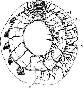 Кровеносная система образована сердцем, состоящим из пары желудочков и двух пар предсердий, и кровеносными сосудами. От желудочков отходит аорта (рис. 435), по которой кровь поступает в систему лаку-нарных пространств, окружающих кишечник, гонады, печень и другие внутренностные органы. Венозная кровь из лакун поступает в органы дыхания — жабры. Окисленная кровь из задней пары жабр изливается в