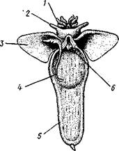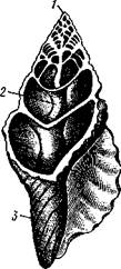 Рис. 440. Крылоногий моллюск Clione limacina (по Боасу):; — околоротовые придатки, 2 — щупальца, 3 — плавник — боковая часть ноги, 4 — совокупительный орган, 5 — внутренностный мешок (туловище), 6 — средняя часть ноги Рис. 441. Продольный распил раковины Cha- ronia (по Оуэну): 1 — вершина раковины, 2 — столбик, 3 — сифо-нальный вырост раковины устья, для замыкания которого она и служит при втягивании животного. Некоторые виды брюхоногих имеют более просто устроенную раковину колпачковидной формы (см. рис. 462, Г). Это не примитивные, но вторично упрощенные в отношении раковины брюхоногие, так как личинки их сначала обладают более или менее завитой раковиной, которая лишь позже принимает вид колпачка. Раковина брюхоногих состоит из тонкого органического наружного слоя (periostracum), под которым лежит фарфоровидвый слой (ostra-cum), образованный известковыми пластинками, расположенными перпендикулярно к поверхности раковины. Углекислая известь добывается из заглатываемой животным воды и пищи. У некоторых брюхоногих (Haliotis, Turbo и др.) имеется еще внутренний перламутровый слой (с. 476).