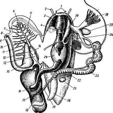 Рис. 446. Вскрытая виноградная улитка (из Бриана): 1 — губное щупальце, 2 — глазное щупальце, 3 — глотка, 4 — церебральный ганглий, 5 — легкое, 6 — легочная вена, 7— перерезанное легочное отверстие, S — анальное отверстие, 9 — отверстие мочеточника, 10 — прямая кишка, II — мочеточник, 12 — предсердие, 13 — желудочек сердца, 14 — перикардий, 15 — почка, 16 — желудок, 17 — печень, 18 — гермафродитная железа, 19 — герма-фродитный проток, 20 — белковая железа, 21 — семяприемник, 22 — канал семяприемника, 23 — яйцесемяпровод. 24 — семяпровод, 25 — мешок любовных стрел, 26 — пальцевидные железы, 27 — бич, 28 — пенис, 29 — слюнные железы