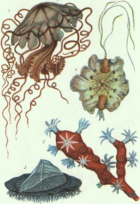 Таблица V. Кишечнопо лестные: / — Сцифоидная медуза Floresca panhenia (по Геккелю). 2 — Плавающий одиночный гидроид Velella velella из Chondrophora (по Савилову). 3 — Благородный коралл Corallium rubrum (из Лейкарта). 4 — Ползающий гребневик Ctenoplana duboscqui (по Давыдову).