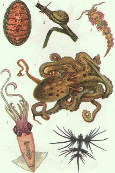 Таблица VIL Моллюски: / — Хитон Tonicella granulata (из Яковлевой). 2 — Легочная улитка Tachea nemoralis (по Мезенхеймеру). 3 — Голожаберный моллюск Aeolis coronata (из Геккеля). 4 — Голожаберный моллюск Glaucus lineatus, живущий на поверхности моря и прикрепляющийся к пленке поверхности натяжения; вид с брюшной стороны (по Савилову). 5 — Глубоководный кальмар Thaumatolampas diadema с органами свечения (из Рассэла и Ионга). 6 — Осьминог Eledone moschata (по Иатта).