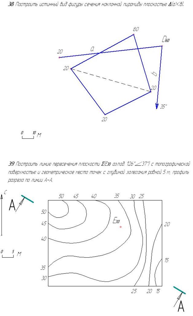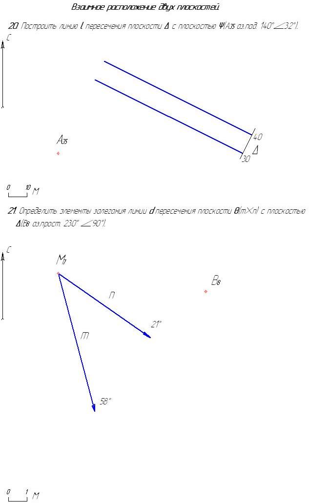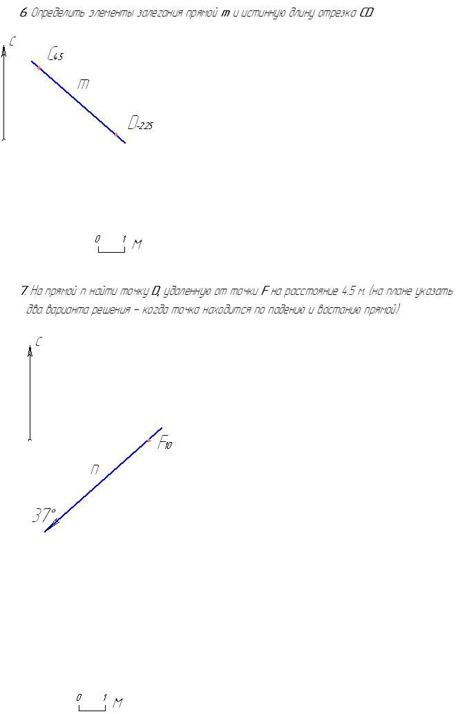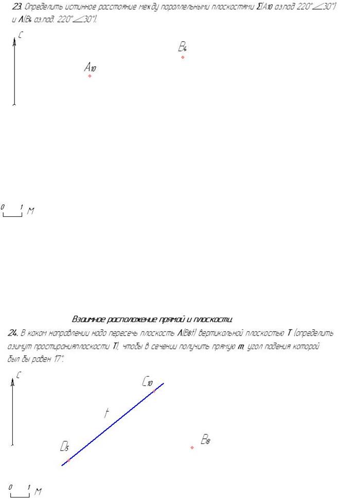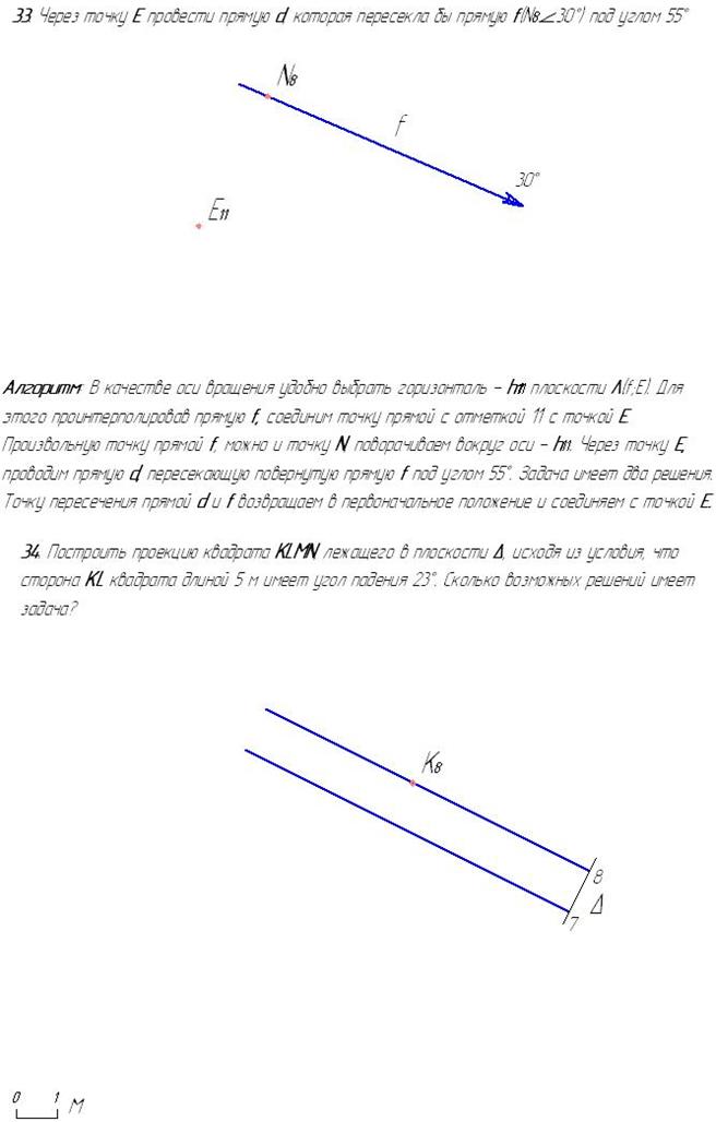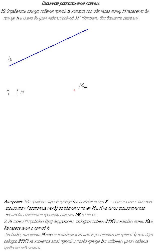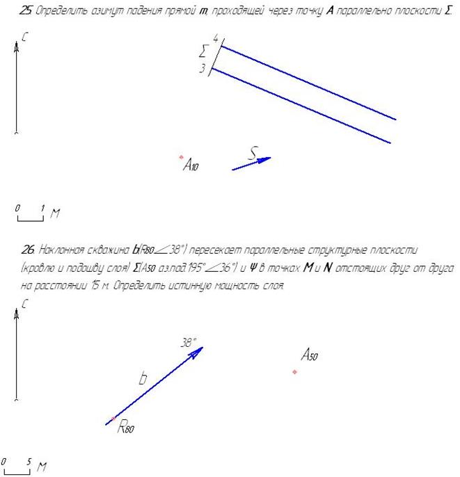 Одним из условий успешного освоения курса инженерно-геологической графики является систематическое решение задач по основным разделам курса. Приходя на практические занятия студент должен: - проработать соответствующий методический материал по теме; - иметь при себе чертёжные принадлежности: простые карандаши марки 2Т и ТМ, два треугольника, транспортир, циркуль и ластик, а также данный альбом или методические указания и папку для черчения. Все построения выполняются острозаточенным карандашом. Линии проекционной связи и все линии вспомогательных построений следует проводить сплошными тонкими линиями карандашом Т или 2Т. Полученные результаты (построенный геометрический образ – точка, линия, фигура и т.п.) на всех проекциях выполняются карандашом ТМ. Все линии построений, проведённые при решении задач, необходимо сохранять. Буквенные и числовые обозначения на чертежах должны быть выполнены чертёжным шрифтом размер 3,5 или 5 по ГОСТ 2.304-81. Решенные задачи по каждому заданию студент должен представить преподавателю в конце занятия. Студенты, не успевшие выполнить задачи очередной работы, заканчивают их дома и представляют преподавателю в часы консультаций, при этом студент должен дать пояснения по решению каждой задачи. Решение каждой задачи инженерно-геологической графики обычно состоит из двух этапов – решение в пространстве и выполнение её на чертеже. При этом полезно прибегать к моделированию изучаемых геометрических форм простейшими средствами (карандаш, линейка, тетрадь и т.д.). Приступая к решению задачи, следует составить сначала ясный план решения в пространстве, а затем уже осуществить его выполнение на чертеже. Для решения некоторых наиболее трудных задач вместе с условием даётся алгоритм, который необходимо записать с помощью условных обозначений на чертеже данной задачи. Для успешного решения задач от студента требуются знания основных теорем элементарной геометрии – планиметрии и стереометрии. При графических решениях задачи точность ответа зависит не только от выбора правильного пути её решения, но и от точности геометрических построений. Поэтому, решая задачу, необходимо пользоваться качественным инструментом и аккуратно выполнять все геометрические построения. К итоговой аттестации по инженерно-геологической графике допускаются студенты, выполнившие все работы. На титульном листе и в верхней части каждой страницы студент должен разборчиво написать свои фамилию и инициалы, а также шифр группы. Важно! Если в условии задачи не указан масштаб, то единица масштаба принимается равной 1 см.