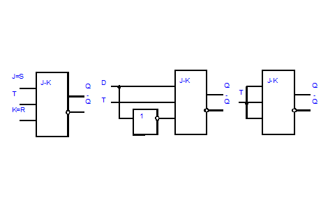 J-K-триггер, так же как и все типы триггеров, получаемые на его основе, является триггером с внутренней задержкой: в момент действия импульса Т информация записывается в основной триггер, а после его окончания состояние основного триггера передается во вспомогательный. R-St- и Dt-триггеры являются тактируемыми (рис. 13.5.а., рис. 13.5.б.); R-S-триггер получают подачей на вход J сигнала S; а на вход К-сигнала R; Dt - триггера создается введением инвертора в цепь входа К. Триггер со счетным запуском (Тt-триггер) реализуется подключением входом J и К ко входу Т. Аналогичные схемы всех рассмотренных триггеров можно получить используя для этого логические элементы ИЛИ-НЕ. При этом необходимо учесть, что асинхронный R-S-триггер на элементах ИЛИ-НЕ имеет прямые входы.