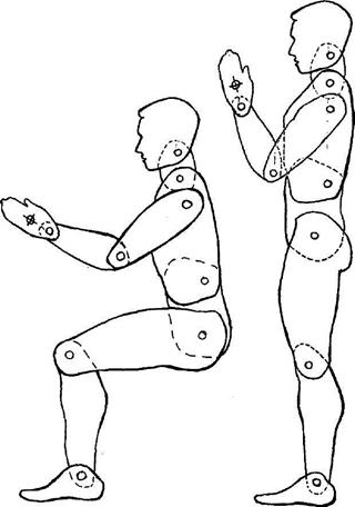 В основе манекенов лежит костная система человека, на которой определены центры окружностей — суставы, а контуры фигуры образуют касательные к этим окружностям {рис. 30). Рисунок завершают простой подрисовкой кистей и стоп. Манекены снабжены шарнирами в местах расположения суставов, позволяющими придавать фигурам необходимые положения, занимаемые человеком при выполнении различных работ (рис. 31). Такие манекены обычно выполняются в натуральную величину, а также в масштабах 1:5; 1:10, и помещаются на чертежах, макетах соответствующих рабочих мест, выполненных в том же масштабе (рис. 32). Габариты манекенов должны соответствовать не только средним, но и пороговым антропометрическим размерам. Методика использования манекенов достаточна проста. Помощь при проектировании может оказать методика наложения на чертежи проектируемых мест схем, так называемых нормальных и максимальных зон. Эти схемы могут использоваться для наложения на рабочие зоны в горизонтальной плоскости (например, плоскость рабочего стола), а также в вертикальных плоскостях, параллельных и перпендикулярных к оси зрения. ??????стр82 текст