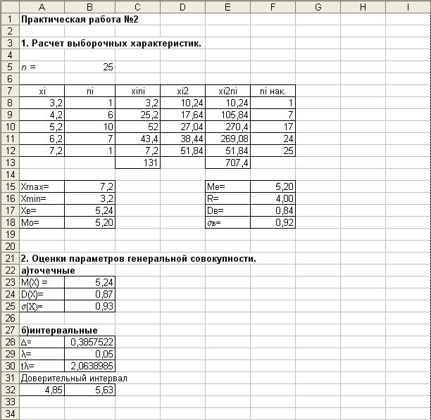 Задание к работе: По сгруппированным данным, полученным в практической работе №1: 1. Рассчитать выборочные характеристики: 2. Дать точечные оценки параметров генеральной совокупности 3. Дать интервальную оценку для