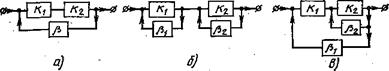 Рис. 2.2.2. Виды обратной связи: а - однопетлевая; б - двухпетлевая с независимыми петлями; в - многопетлевая с местной петлей.