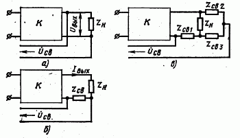 Ко входу устройства цепь обратной связи также можно подключить тремя способами: последовательно с источником сигнала (рис. 2.2.4, а), параллельно ему (рис. 2.2.4, б) и смешанным способом (рис. 2.2.4, в); в первом случае связь называют последовательной обратной связью, во втором - параллельной обратной связью и в последнем - комбинированной по входу или смешанной по входу обратной связью. Обратную связь называют положительной, если ее (напряжение находится точно в фазе с ЭДС источника сигнала, подводимой ко входу устройства, и складывается с последней, увеличивая таким образом напряжение сигнала на входе. Если же напряжение обратной связи находится точно в противофазе с ЭДС источника сигнала, а, следовательно, вычитается из нее, уменьшая сигнал на входе, обратную связь называют отрицательной. При сдвиге фаз между напряжением обратной связи и ЭДС источника сигнала, отличающимся от 0° и от 180°, обратную связь называют комплексной. Для обобщенной структурной схемы усилителя с положительной обратной связью (рис.2.2.1) можно записать: