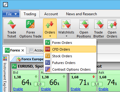 Откройте “Forex Orders” для торговли валютой. Для торговли CFD откройте“CFDs Orders”, “Stock Orders” или “Future Orders”.