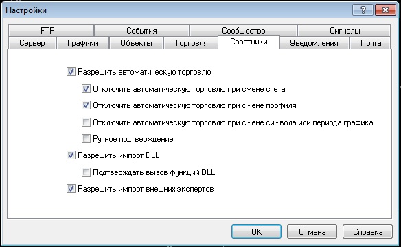 2. Нажмите Сервис-Настройки-Советники и установите нужные галочки.