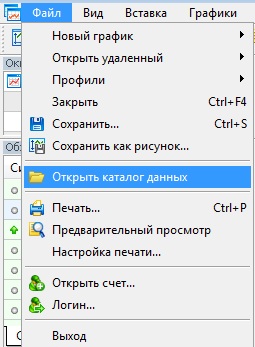 3. Нажмите Файл-Открыть каталог данных. Откроется папка в которой хранятся советники, шаблон и библиотеки dll.