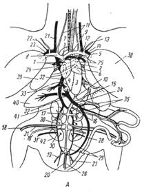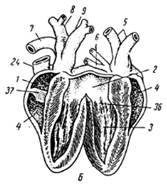 Рис. 42. Схема кровеносной системы голубя: А – общий вид (белым цветом показаны кровеносные сосуды с артериальной кровью, чёрным – с венозной), Б – вскрытое сердце: 1 – правое предсердие, 2 – левое предсердие, 3 – левый желудочек, 5 – лёгочная артерия, 6 – лёгочная вена, 7 – правая дуга аорты, 8 – правая безымянная артерия, 9 – левая безымянная артерия, 10 – спинная аорта, 11 – общая сонная артерия, 12 – подключичная артерия, 13 – плечевая артерия, 14 – грудная артерия, 15 – внутринностная артерия, 16 – брыжеечная артерия, 17 – почечная артерия, 18 – бедренная артерия, 18' – седалищная артерия, 19 – подвздошная артерия, 20 – хвостовая артерия, 21 – ярёмная вена, 22 – плечевая вена, 23 – грудная вена, 24 – правая передняя полая вена, 25 – левая передняя полая вена, 26 – хвостовая вена, 27 – внутренняя подвздошная вена, 28 – копчиково-брыжеечная вена, 29 – воротная вена почек, 30 – общая подвздошная вена, 31 – бедренная вена, 31' – седалищная вена, 32 – задняя полая вена, 33 – печёночные вены, 34 – воротная вена печени, 35 – вены пищеварительного тракта, 36 – трёхстворчатый клапан между левым предсердием и левым желудочком, 37 – клапан между правым предсердием и правым желудочком, 38 – грудные мышцы, 39 – лёгкое, 40 – печень, 41 – семенник, 42 – почка.