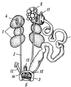 Рис. 43. Мочеполовая система голубя: А – самец, Б – самка, 1 – почки, 2 – мочеточник, 3 – полость клоаки, 4 – надпочечник, 5 – семенник, 6 – придаток семенника, 7 – семяпровод, 8 – семенной пузырёк, 9 – яичник, 10 – левый яйцевод, 11 – воронка яйцевода, 12 – остаток редуцированного правого яйцевода, 13 – прямая кишка, 14 – мочевое отверстие, 15 – половое отверстие.