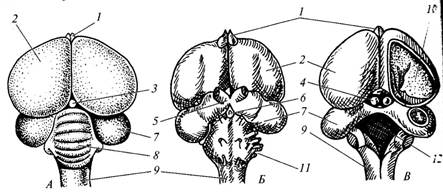 Рис. 44. Головной мозг голубя сверху (А), снизу (Б) и со вскрытым боковым желудочком и удалённым мозжечком (В): 1 – обонятельные доли переднего мозга, 2 – большие полушария переднего мозга, 3 – эпифиз, 4 – зрительные бугры промежуточного мозга, 5 – хиазма зрительных нервов, 6 – воронка с гипофизом, 7 – зрительные доли среднего мозга, 8 – мозжечок, 9 – продолговатый мозг, 10 – полосатые тела, 11 – основания черепно-мозговых нервов, 12 – ромбовидная ямка.