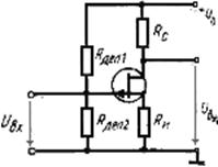 где Введение резистора Емкость этого конденсатора при заданно минимальной частоте входного сигнала может быть рассчитана из условия Все сказанное остается справедливым и при построении каскада с использованием МДП-транзистора со встроенным каналом. В этом случае могут быть только количественные отличия, обусловленные тем, что передаточная характеристика транзистора имеет продолжение в первом квадранте. При этом могут измениться доли напряжений смещения, создаваемые резистором Rи и делителем на резисторах