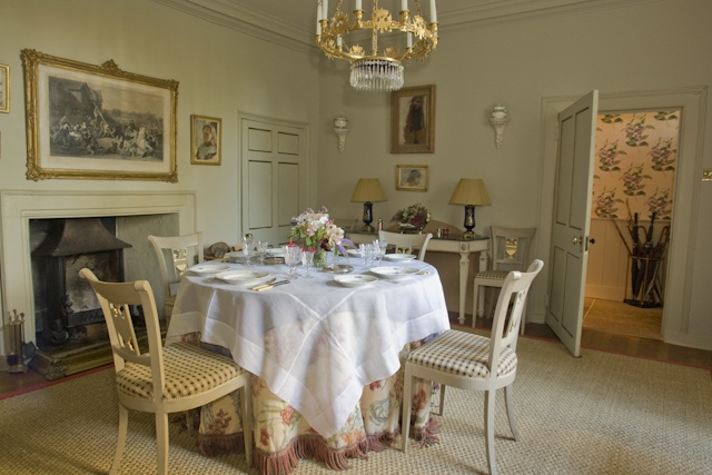 1. pictures/wall? 2. fireplace/door? 3. plates/table? 4. vase/table? 5. chairs/table?