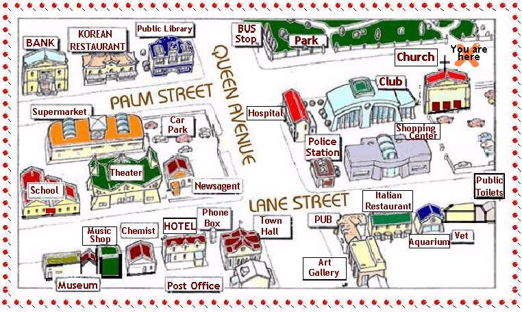 1. Where is the supermarket situated? 2. Where is the shopping centre situated? 3. Where is the music shop situated? 4. Where is the newsagent situated? 5. Where is the post office situated? 6. Where is the aquarium situated? 7. Where is the chemist situated? 8. Where is the hotel situated? 9. Where is the art gallery situated? 10. Where is the theater situated?