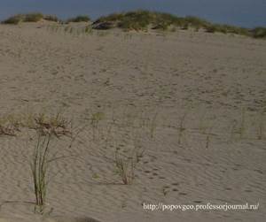 Разрушительная деятельность: дефляция и корразия Перенос материала ветром Аккумулятивная деятельность ветра Эоловые формы рельефа Деятельность ветра является одним из важнейших геологических и рельефообразующих факторов на поверхности суши. Все процессы, обусловленные деятельностью ветра, создаваемые ими отложения рельефа и формы называют эоловыми (Эол - бог ветров в греческой мифологии). Эоловые процессы протекают на всей территории суши, но наиболее активно проявляются в пустынях, полупустынях, на побережьях морей и океанов. Этому способствует оптимальное сочетание условий, способствующих развитию эоловых процессов: 1) отсутствие или разреженность растительного покрова, определяющее наличие непосредственного контакта горных пород, слагающих территорию, и воздушных потоков атмосферы; 2) частые ветры; 3) наличие больших объёмов рыхлого материала, способного перемещаться ветром. Необходимо отметить, что существенное значение при «поставке» обломочного материала, в дальнейшем перемещаемого ветром, в пустынях (для которых, как известно, характерны значительные суточные колебания температуры) имеет температурное выветривание. Существенную роль эоловые процессы играют также в сухих степях, саваннах, приледниковых областях, долинах крупных рек и других открытых ландшафтах. Переносимый ветром тонкий материал может перемещаться на сотни и даже тысячи километров (достаточно отметить, что на значительных участках океанического дна вклад эолового материал достигает 50-70% и более). Геологическая деятельность ветра складывается из процессов разрушения пород, переноса материала и его аккумуляции, тесно взаимосвязанных и протекающих одновременно. Разрушительная деятельность ветра Разрушительная деятельность ветра складывается из двух процессов - дефляции и корразии. Корразия (от лат. «corrado» — скоблю, соскребаю) – процесс механического истирания горных пород обломочным материалом, переносимым ветром. Заключается в обтачивании, шлифовании, и высверливании горных пород. Частицы, переносимые ветром, ударяясь о поверхность встречающихся на пути коренных горных пород, действуют в качестве природного «абразивного инструмента», вырабатывая на их поверхности штрихи, борозды, ниши и другие характерные формы. В процессе такого обтачивания происходит также образование нового обломочного материала, вовлекаемого в процесс дефляции (грубой аналогией подобного процесса может служить действие абразивного инструмента на предмет - в результате обработки предмет изменяет форму, а удаляемая часть превращается в стачиваемый мелкий материал). Таким образом, процессы корразии и дефляции взаимосвязаны и протекают одновременно. Перенос материала ветром Перенос материала ветром может осуществляться в следующих формах: перекатыванием, путем скачкообразных движений и во взвешенном состоянии. Перекатыванием или скольжением перемещаются крупные зёрна песка и, при штормовых и ураганных ветрах, гальки и щебень. Перемещение песка в пустыне: Перемещение во взвешенном состоянии характерно для пылеватых частиц. Частицы движутся в воздушном потоке (на высоте до 3-6 км) не опускаясь на поверхность до изменения условий (скорости ветра и пр.). Алевритовый и пелитовый материал при благоприятных условиях (сочетание сухого воздуха аридных обл