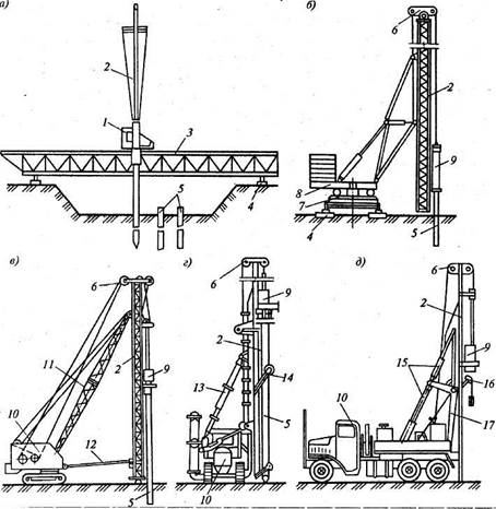вибратора и присоединенного к нему с помощью системы пружин дополнительного пригруза с расположенным на нем электродвигателем. Вибрационный метод наиболее эффективен при несвязных водонасыщенных грунтах. Применение метода для погружения свай в маловлажные плотные грунты возможно лишь при устройстве лидирующих скважин, т. е. при предварительном пробуривании скважин. Более универсальным является виброударный способ погружения свай с помощью вибромолотов. При работе вибромолота наряду с вибрационным воздействием на сваю периодически опускается ударник, оказывая и динамическое воздействие на голову сваи. Наиболее распространены пружинные вибромолоты. В них при вращении валов с дебалансами в противоположных направлениях создаются постоянные колебания. Когда зазор между ударником и наковальней сваи оказывается меньше амплитуды колебаний, ударник периодически ударяет через наковальню по свае. Вибромолоты могут самонастраиваться, т. е. увеличивать энергию удара с повышением сопротивления грунта погружению сваи. Масса ударной части вибромолота применительно к погружению железобетонных свай должна быть не менее 50% от массы сваи и составлять 650..1350 кп. Виброударный способ применим в связанных плотных грунтах, и позволяет в 3...8 раз быстрее при одинаковой мощности с вибрационным способом осуществлять погружение свай в грунт за счет одно- временной вибрации и забивки. При этом должно быть обеспечено жесткое соединение вибропогружателя со сваей. Метод вибровдавливания основан на комбинации вибрационного или виброударного воздействия на сваю и статического пригруза. Вибровдавливающая установка состоит из двух рам. На задней раме находятся электрогенератор, работающий от тракторного двигателя и двухбарабанная лебедка, на передней раме размещены направляющая стрела с вибропогружателем и блоки, через которые проходит к вибропогружателю вдавливающий канат от лебедки. В рабочем положении вибропогружатель, расположенный над местом погружения сваи, поднимает сваю и устанавливает ее вместе с закрепленным наголовником на место ее забивки. При включении вибропогружателя и лебедки свая погружается за счет собственной массы, массы вибропогружателя и части массы трактора, передаваемой вдавливающим канатом через вибропогружатель на сваю. Одновременно на сваю действует вибрация, создаваемая низкочастотным погружателем с подрессоренной плитой. Метод вибровдавливания не требует устройства путей для передвижки рабочего агрегата, исключает повреждение и разрушение свай. Особенно эффективен при погружении свай длиной до 6 м. Погружение свай вдавливанием применяют для коротких свай сплошного и трубчатого сечения (3...5 м). Статическое вдавливание осуществляется в такой последовательности: сваю устанавливают в вертикальное положение в направляющей стреле агрегата. Далее на голову сваи опускают и закрепляют оголовник, передающий давление от базовой машины (трактора, экскаватора) через систему блоков и полиспастов непосредственно на сваю, которая благодаря этому давлению постепенно погружается в грунт. После достижения сваей проектной отметки погружение прекращают, снимают наголовник, агрегат переезжает на новую позицию. Применимо статическое вдавливание с использованием одновременно задействованных двух механиз