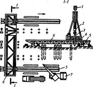 прежде всего используемым оборудованием. У некоторых копров башенного типа мачты опираются на выдвижные рамы, смещающиеся примерно на 1 м. Такими копрами можно забивать сразу сваи двух рядов с одной стоянки, что значительно снижает трассу движения копра и время на его передвижки. При сооружении подземной части жилых зданий нашли применение краны, оснащенные навесным копровым оборудованием, перемещающиеся по рельсовому пути вдоль бровки котлована здания. При устройстве свайных фундаментов зданий большой протяженности рационально применять мостовую сваебойную установку (рис.4.12), представляющую собой передвижной мост, по которому перемещается тележка с копром. Сваи длиной 8... 12 м забивают дизель-молотом. Достоинством мостовой сваебойной установки является возможность точной установки свай в месте забивки, предварительная раскладка свай в зоне работ значительно сокращает операции по
