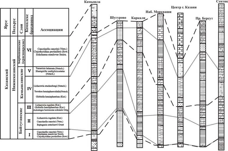 Рис. 112. Расположение отложений брахиопод на стратиграфических шкалах