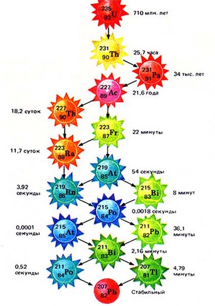 Рис. 131. В магматических породах нет костных останков Если же калий-аргоновый метод использовался для определения возраста, допустим, какой-то песчинки, лежавшей рядом с костными останками, то к чему будет относиться этот возраст?.. Очевидно, что ко времени образования самой песчинки, а вовсе не к тому моменту, когда она оказалась рядом с чьими-то останками. А если пытаться применять этот метод к каменным орудиям труда, то он покажет не время их изготовления, а возраст самого камня. Единственный более-менее корректный вариант – если калий-аргоновый метод применялся для датирования момента образования каких-то магматических пород, имеющих тот же возраст, что и слои, в которых найдены костные останки или орудия труда. Например, осадочные слои образовались примерно в то же время, что и происходило извержение вулкана неподалеку. Но такие случаи уникальны, да и тогда требуется еще доказать, что образование соответствующих геологических слоев было одновременным, чего без датирования каким-то иным методом непосредственно слоев, в которых обнаружены находки, просто невозможно… Гораздо шире для датирования геологических пород используются уран-торий-свинцовые методы. Первичные (материнские) изотопы урана и тория (238U, 235U и 232Th) в процессе радиоактивных превращений образуют длинные цепочки переходящих друг в друга изотопов – радиоактивные ряды распада. Конечными продуктами распада всех трех рядов являются изотопы свинца. Так как геология работает с довольно продолжительными интервалами времени, сравнительно короткоживущими промежуточными членами рядов пренебрегают и рассматривают упрощенные системы со следующими парами материнских и дочерних изотопов: 238U – 206Pb, 235U – 207Pb и 232Th – 208Pb.