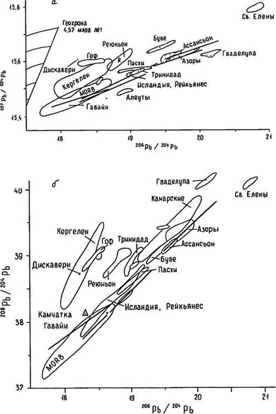 Рис. 133. Соотношения изотопов свинца для вулканических пород океанических островов