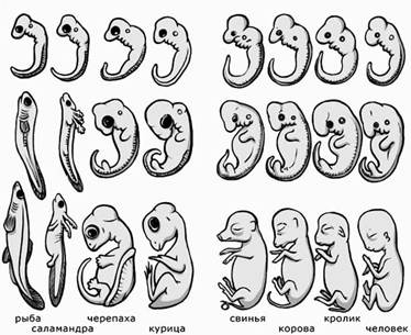 Рис. 35. Сходство зародышей на ранних стадиях развития Откуда же взялся сам человек?.. Ответ прост – его создал Творец, Демиург… По сути, мы получаем лишь некую модификацию креационизма, «обогащенного» идеей деградации. Здесь следует сделать очень важную оговорку. Термином «человек» Белов обозначает не только современного человека, но и представителей других якобы существовавших на Земле «древних рас», перечень которых он берет из ведийской традиции, модифицированной Еленой Блаватской (хотя при этом трактует определения Блаватской достаточно вольно). Из этой же ведийской традиции Белов берет и тезис о постепенной деградации этих «древних рас», ведущих свою «родословную» от некоего «небесного единого прототипа». «Чем больше живое существо будет погружаться в земную юдоль, тем сильнее оно будет отличаться от своего небесного единого прототипа.Этапы деградации впечатляют: тела и души многоруких и многоногих существ были разделены Демиургом пополам. Им на смену пришли двурукие и двуногие циклопы, затем их последовательно сменяли титаны, боги, их потомки – великаны и, наконец, люди. Таким образом, стволовая линия человечества не прерывалась от единого многорукого первопредка, если не считать гипотетическое разделение многоруких существ и основательную перестройку всей конструкции их тел за новый акт творения. Титаны уже имели, судя по мифам, вполне антропоморфный вид» (А.Белов, «Антропологический детектив»).