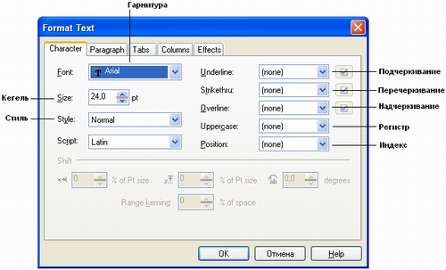 Рис. 12.8. Вкладка Character диалогового окна Format Text Вкладки диалогового окна перечислены ниже.